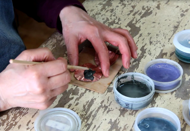 銅板を窯から出した直後は高温なので色が深い赤黒色ですが時間が経って冷めてくると自分が選んだ釉薬の色が出てきます!